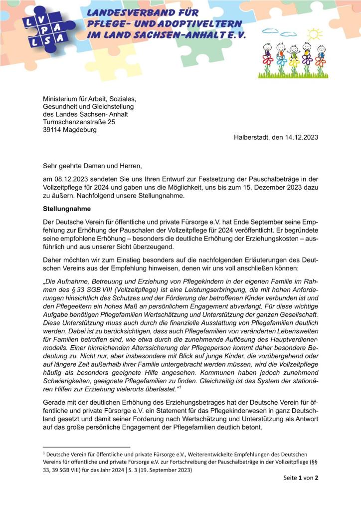 Stellungnahme zum Entwurf zur Festsetzung der Pauschalbeiträge in der Vollzeitpflege für 2024