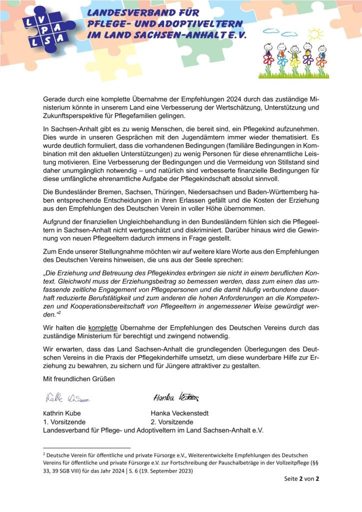 In diesem Entwurf steht deutlich, dass das Land Sachsen-Anhalt den Forderungen des Deutschen Vereins nicht folgen möchte. Das Land möchte die Kosten der Erziehung auf dem Niveau von 2023 belassen und keine Erhöhung vornehmen. Aber gerade diese Leistungen zeigen die Wertschätzung und Unterstützung der ganzen Gesellschaft auf. Ein deutliches Statement zu diesem Entwurf folgt in der Stellungnahme vom Landesverband für Pflege- und Adoptiveltern im Land Sachsen-Anhalt.